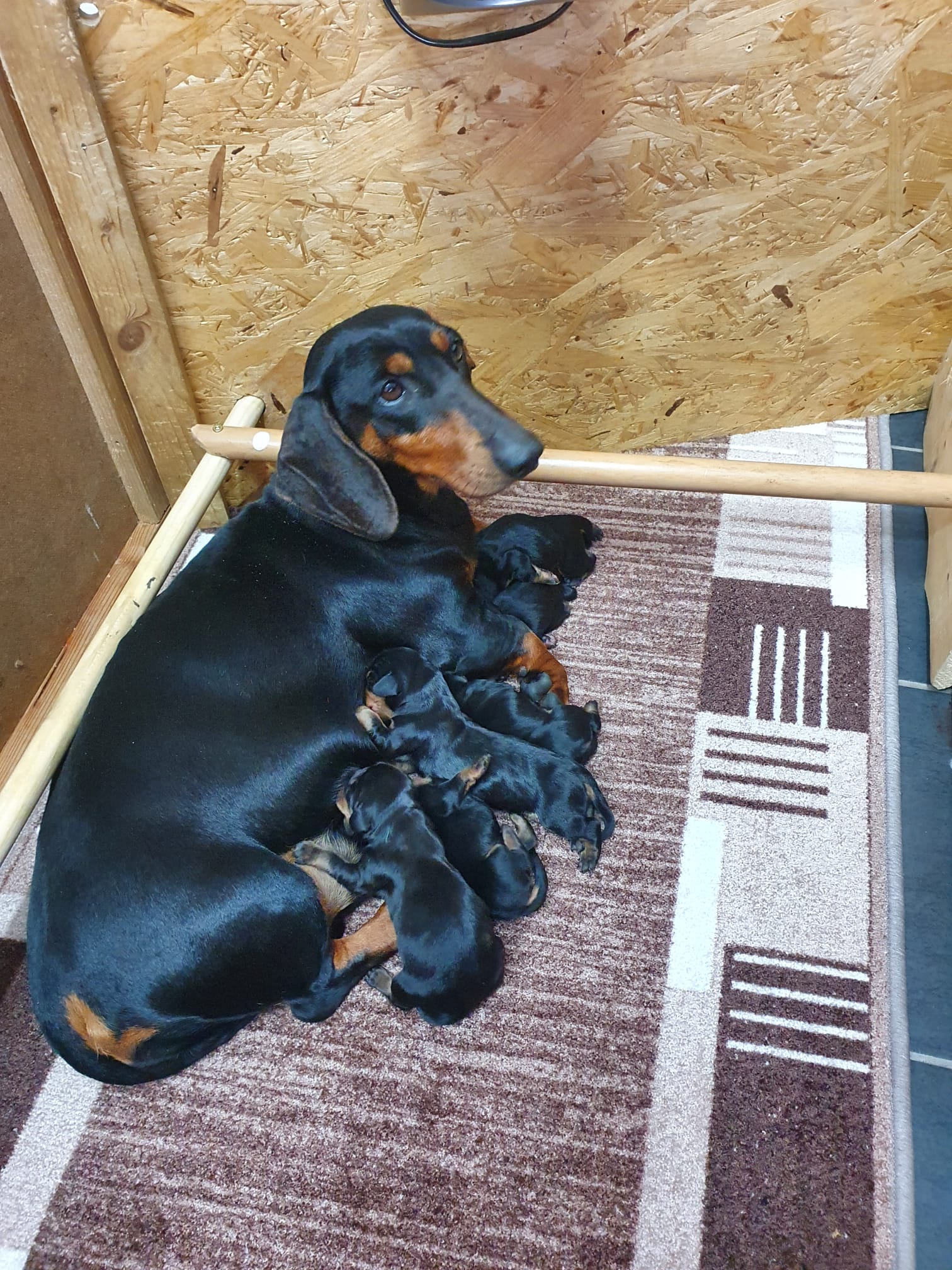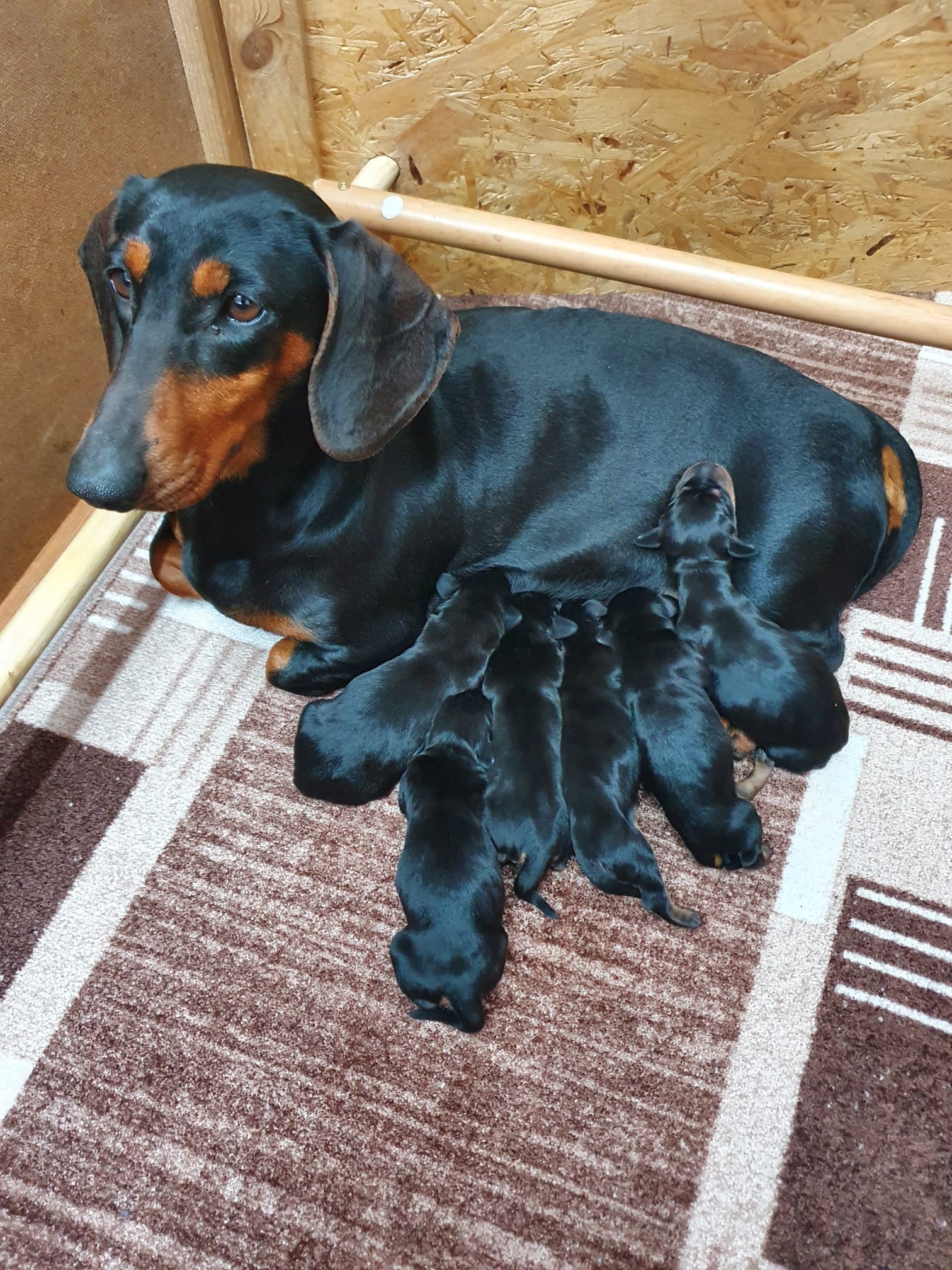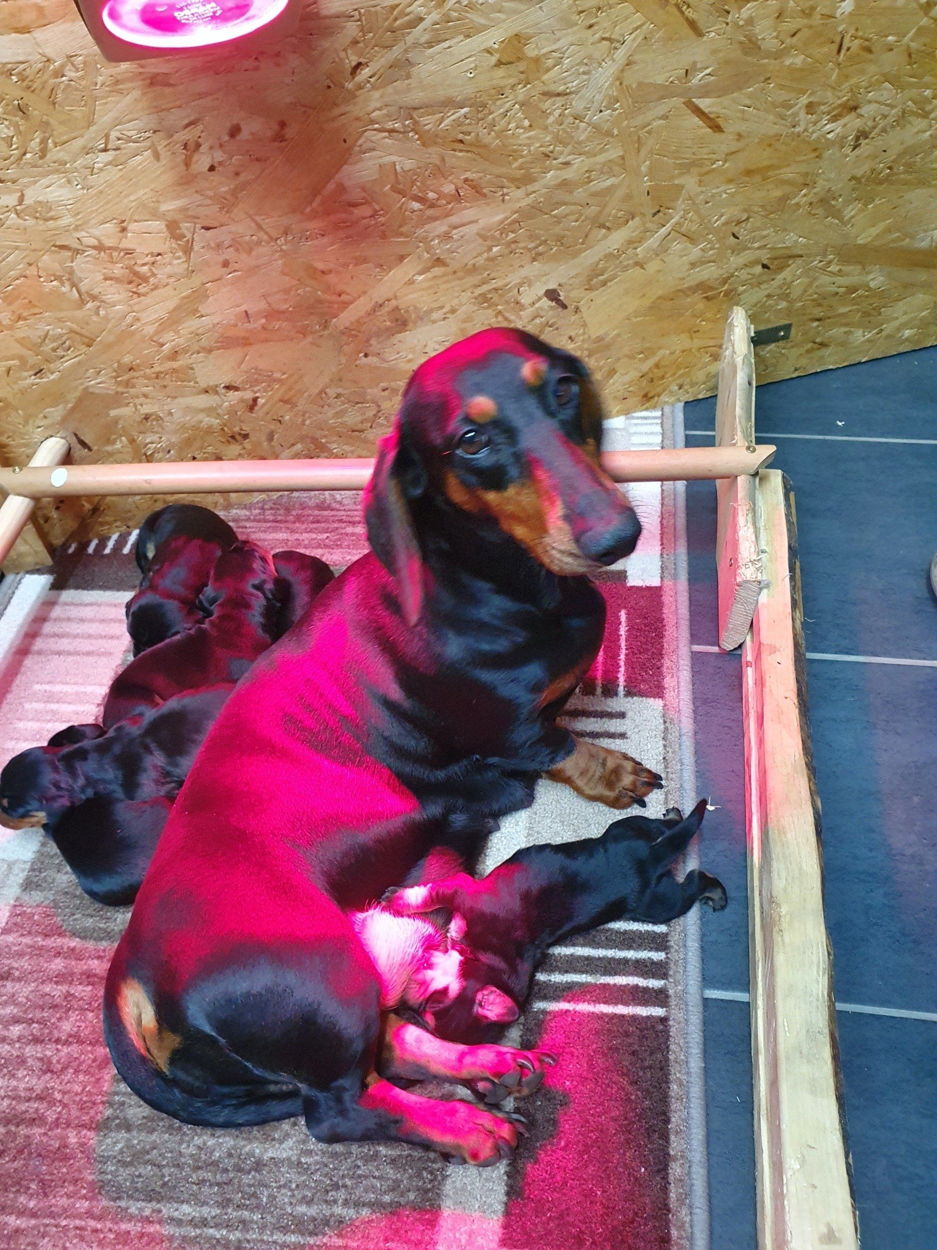 Am 28.04.2022 hat unsere Hündin 6 Welpen geworfen, es sind 3 Rüden und 3 Hündinnen. Sie sind alle sehr gleichmäßig und wohlauf.