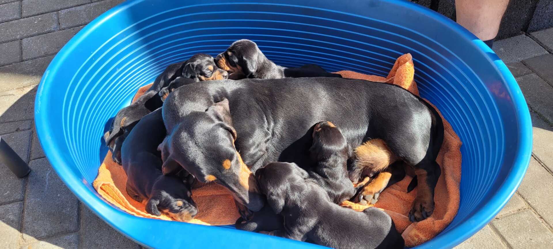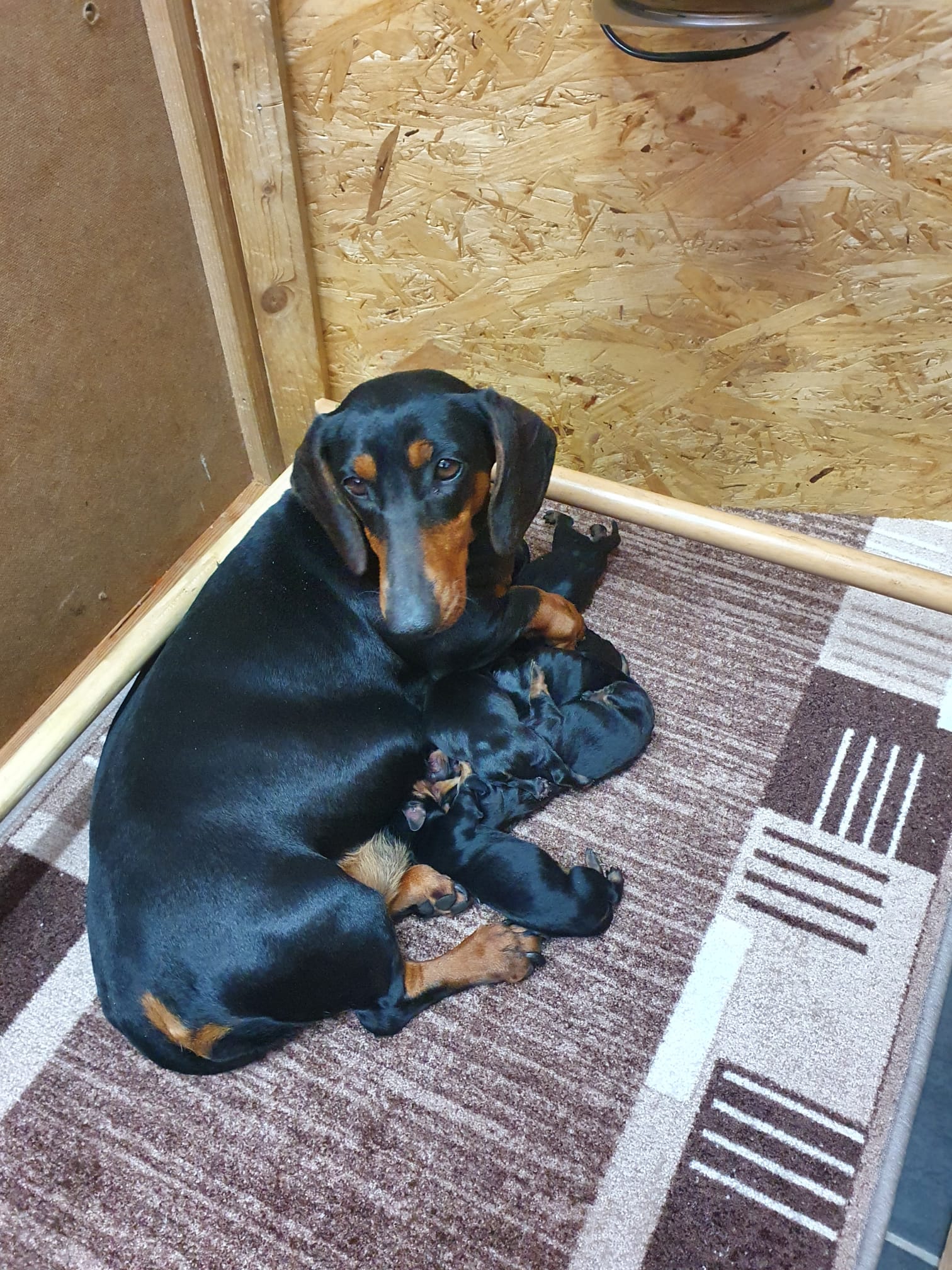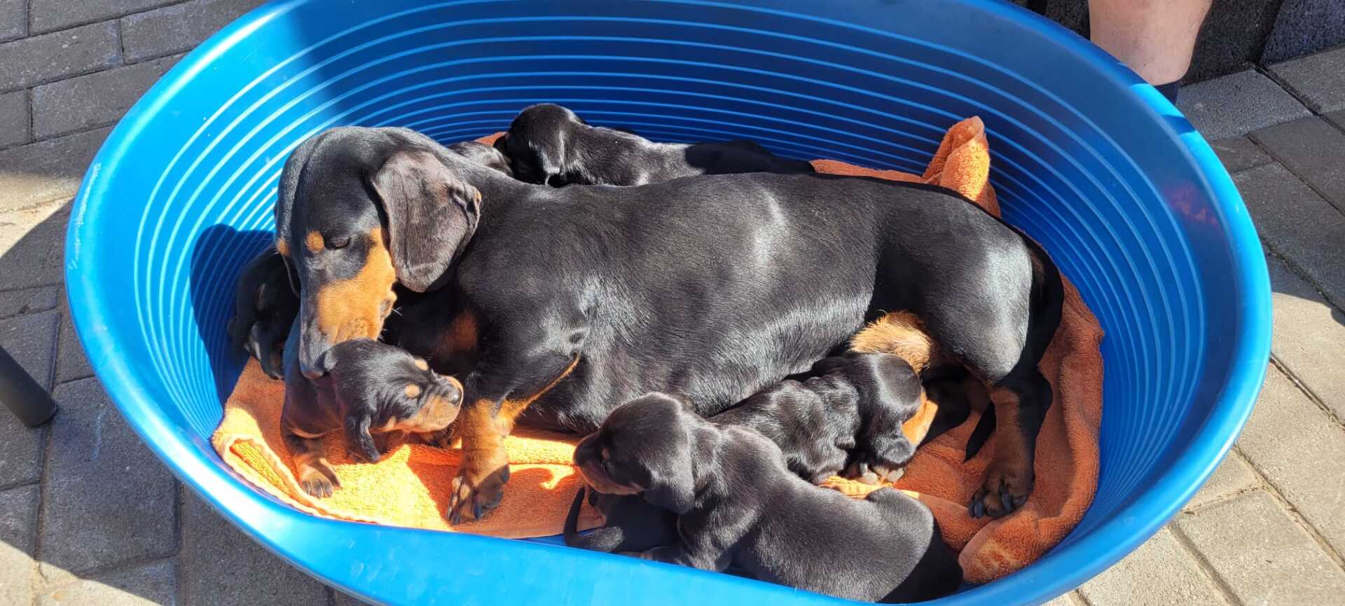 Am 28.04.2022 hat unsere Hündin 6 Welpen geworfen, es sind 3 Rüden und 3 Hündinnen. Sie sind alle sehr gleichmäßig und wohlauf.