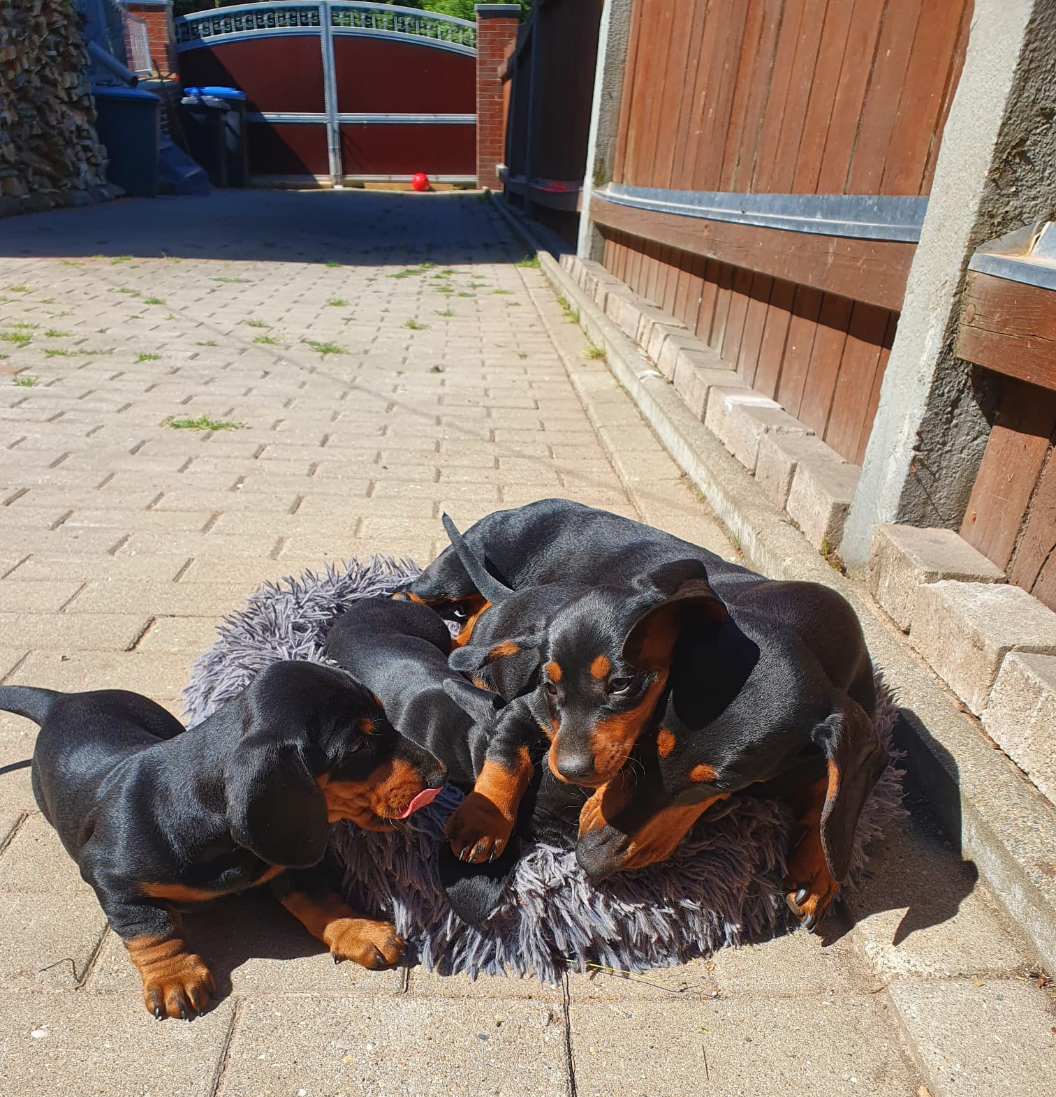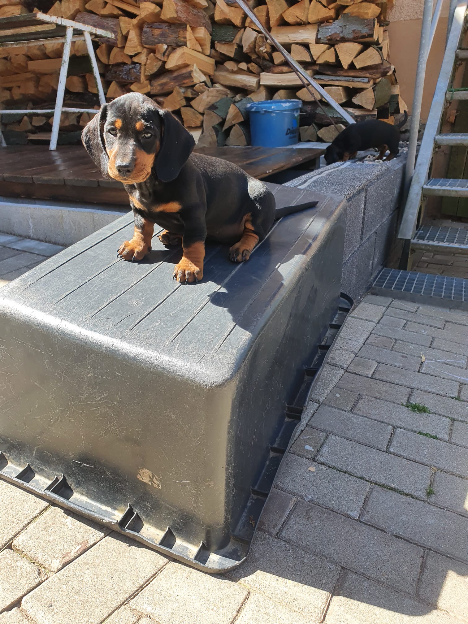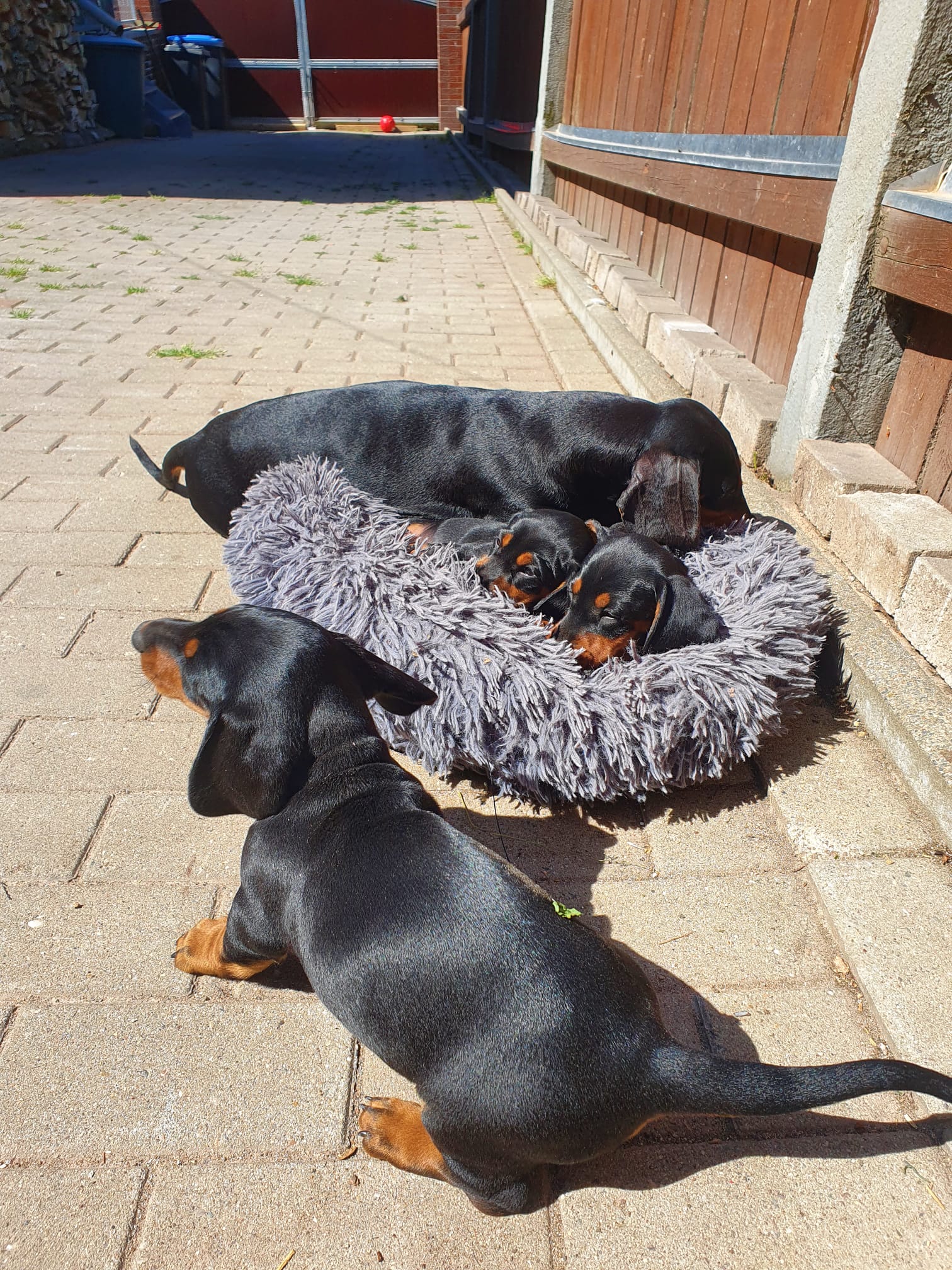 28.05.2022, 4. Woche alle sind wohl auf und erkunden neugierig ihre Umgebung. Der erste Welpen-Besuch ist auch schon erfolgt und die neuen Besitzer freuen sich bereits auf die Übergabe Ende Juni.