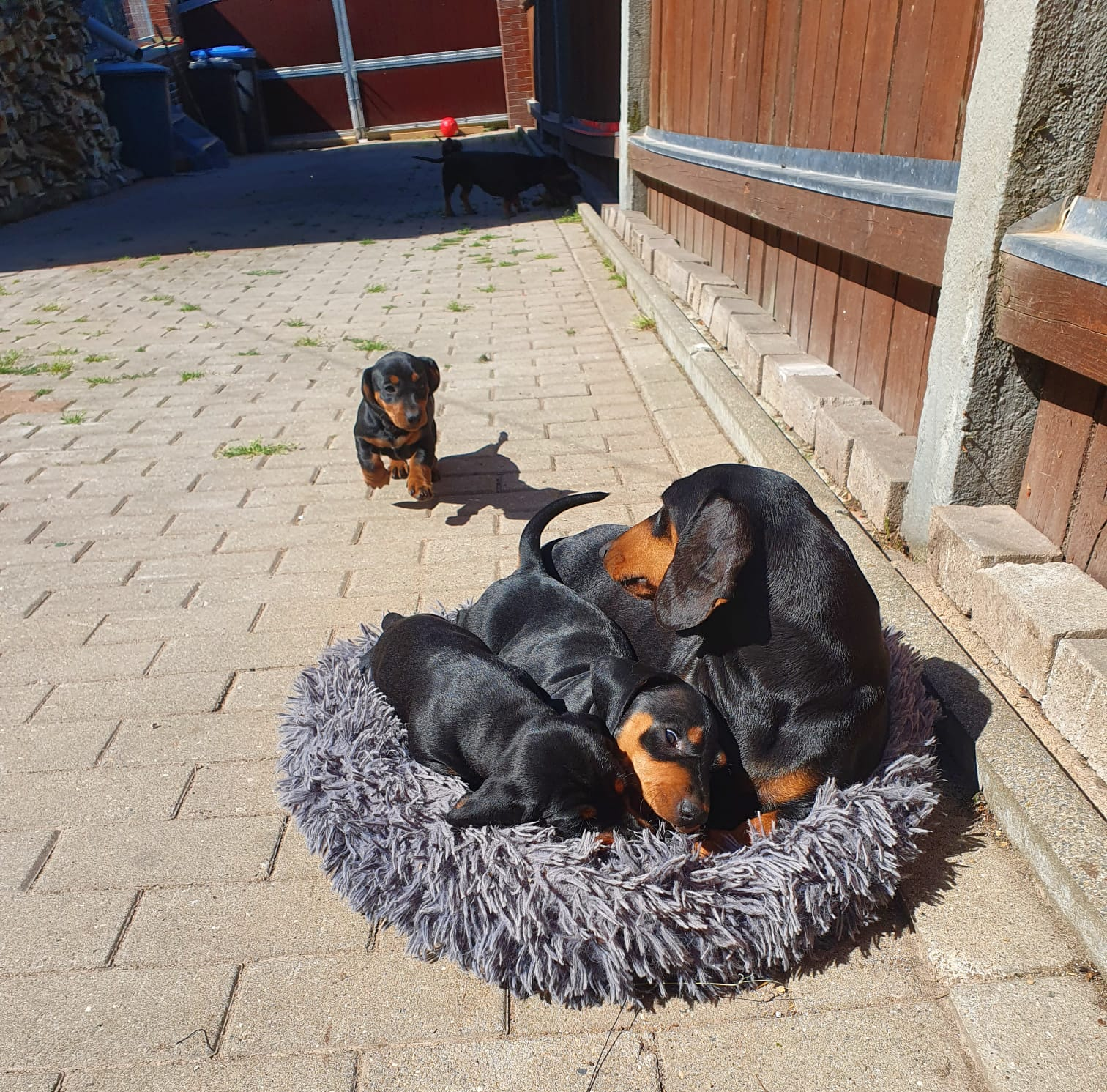 15.05.2022 heute hat unser Wurf die Sonne und unseren Hof kennen gelernt und sichtlich diese Zeit genossen.