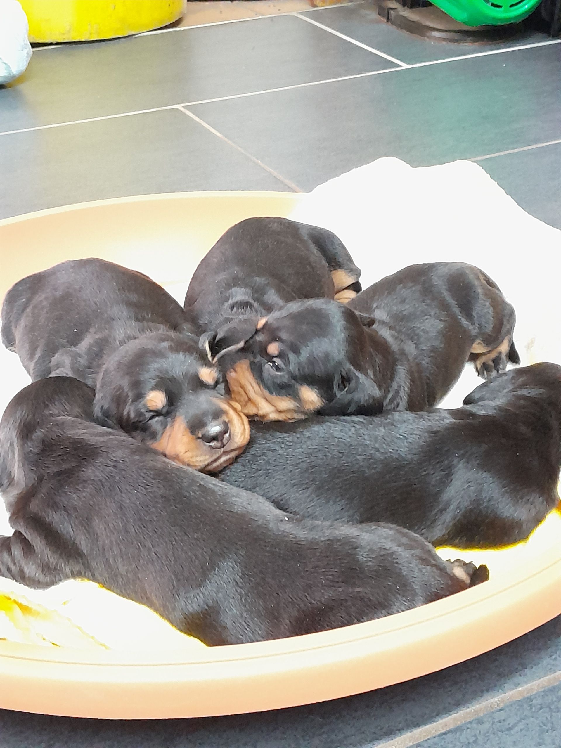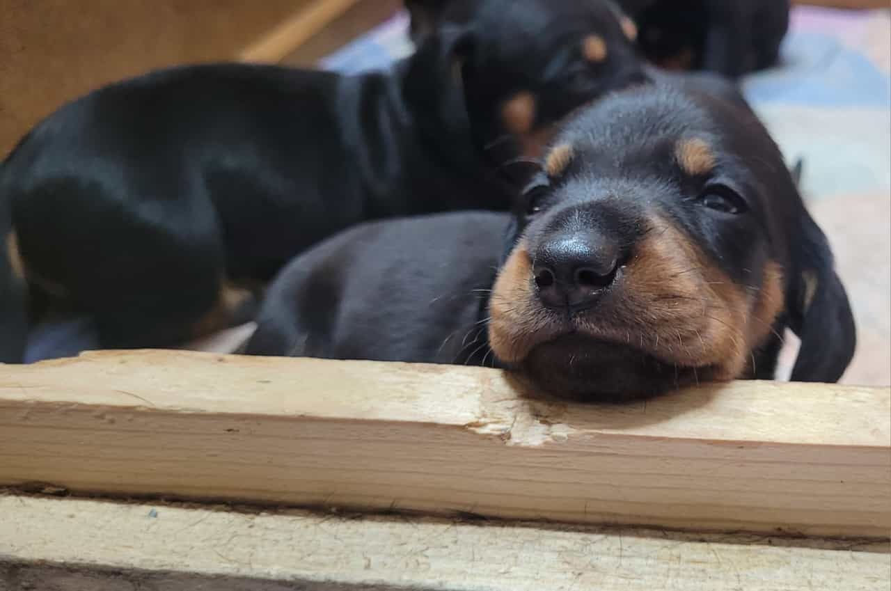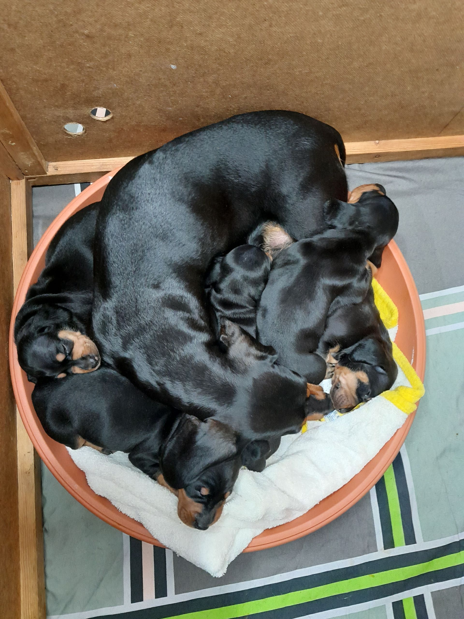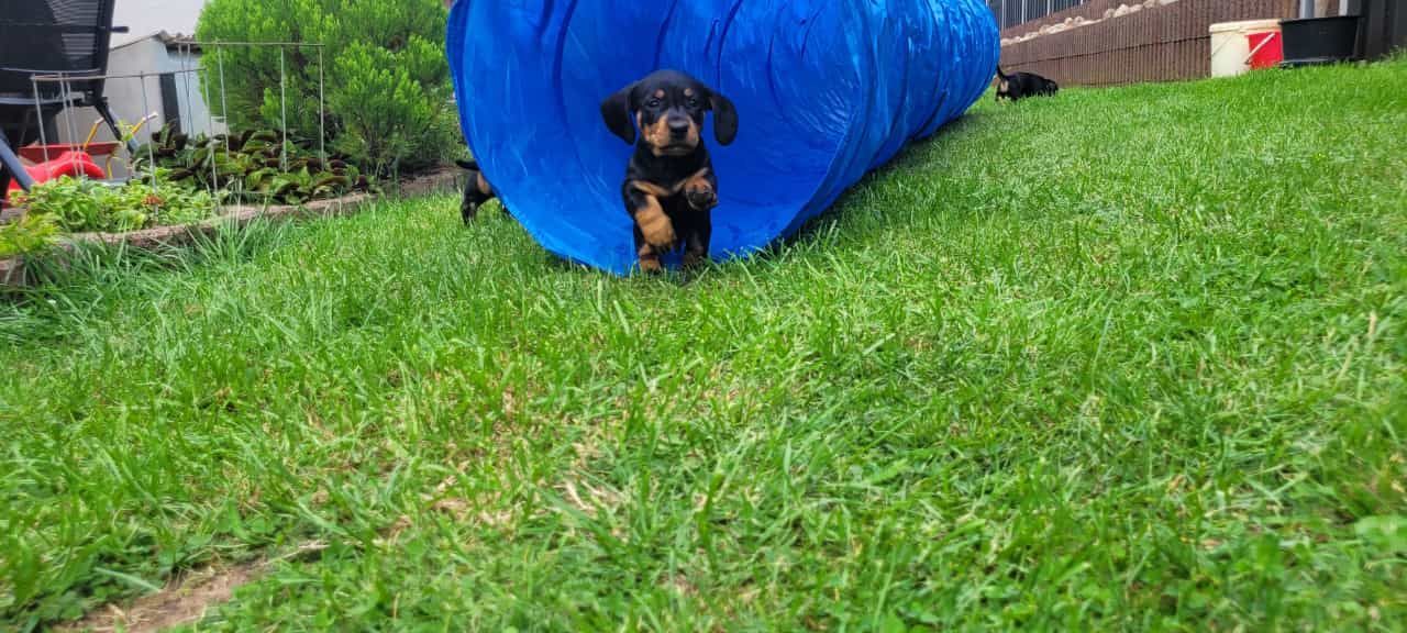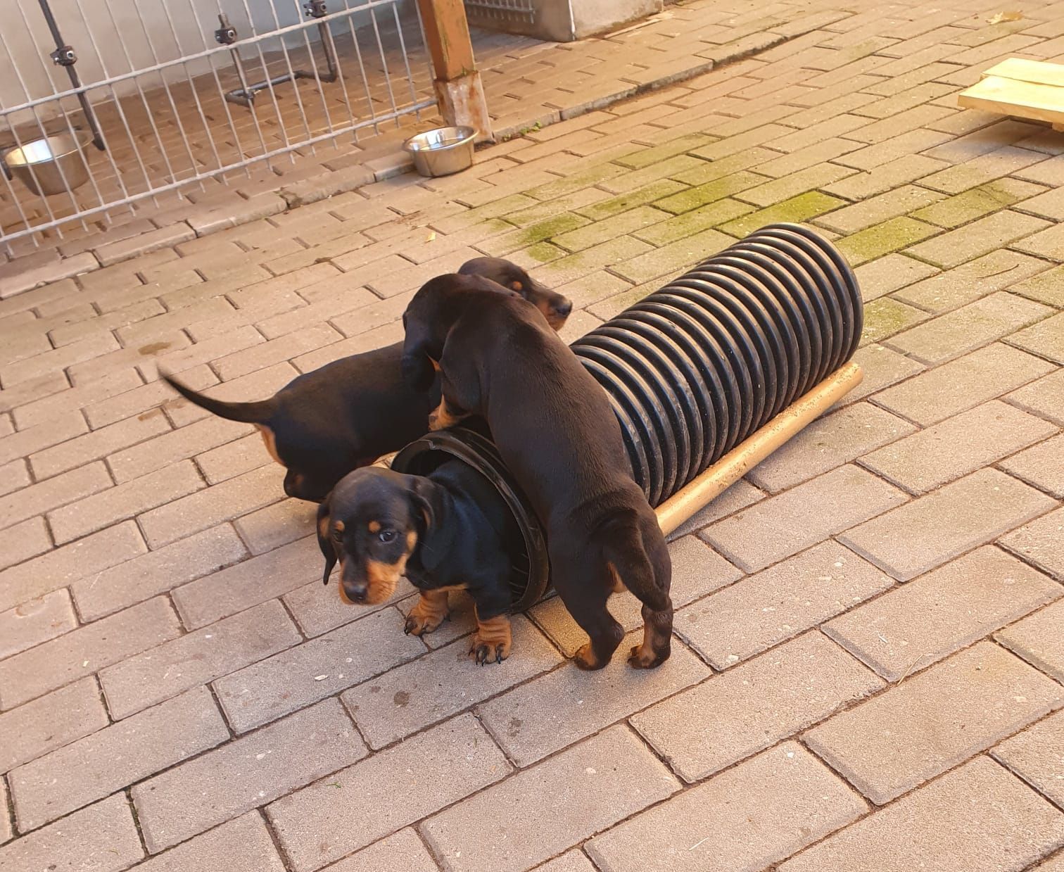 Es sind 5 kräftige, gleichmäßige und sehr mobile Welpen in der Farbe schwarz/rot gewölft worden.