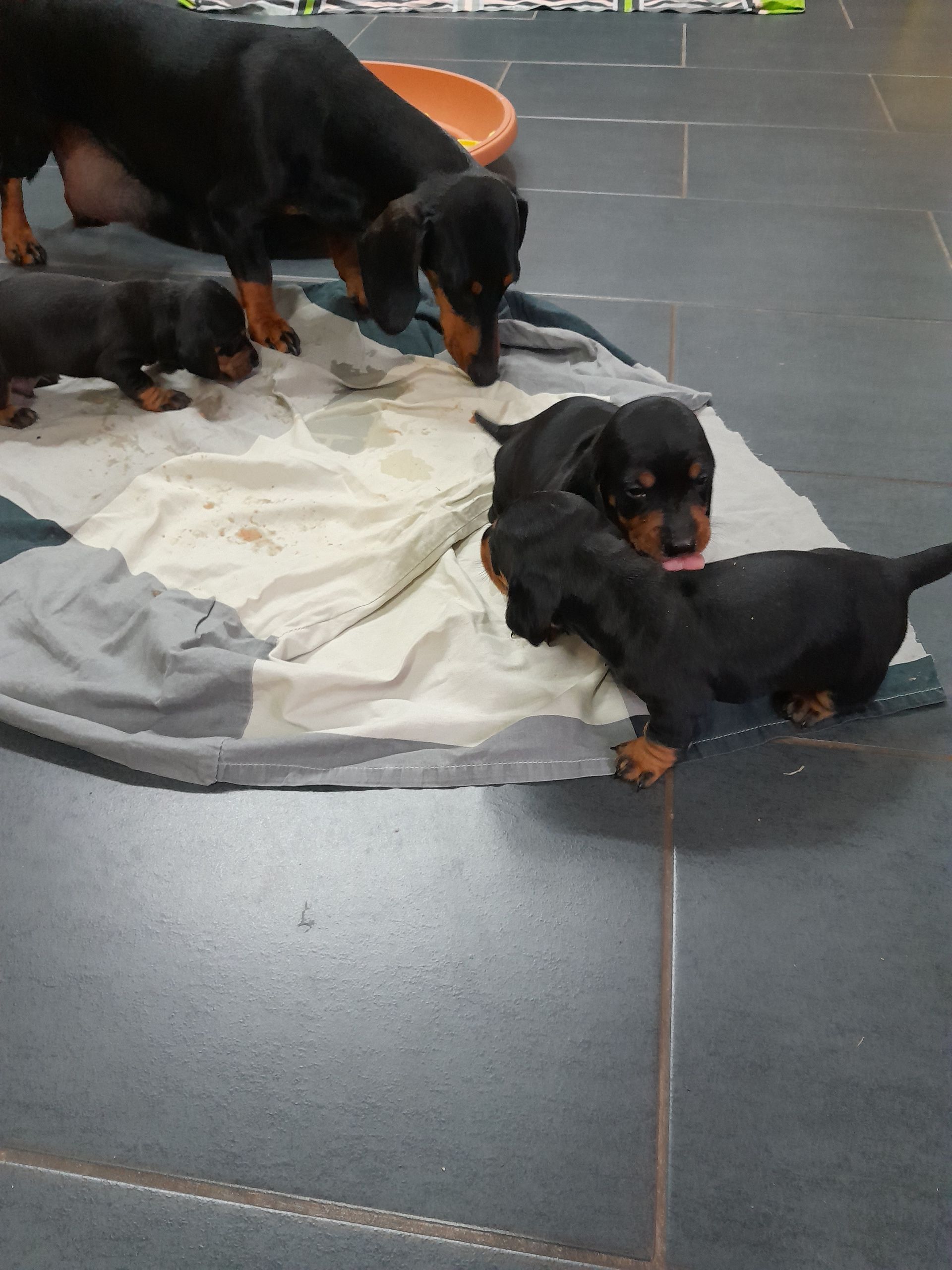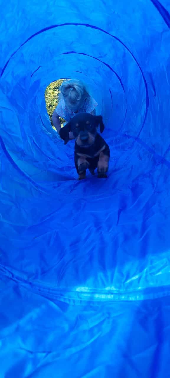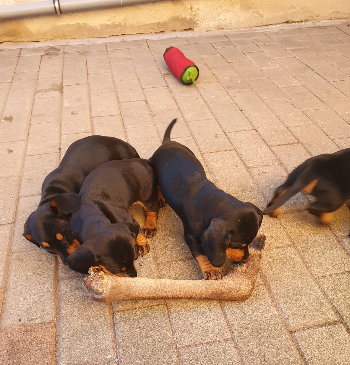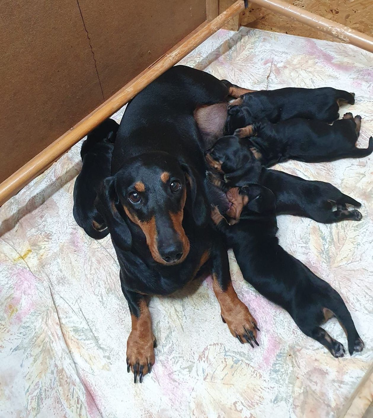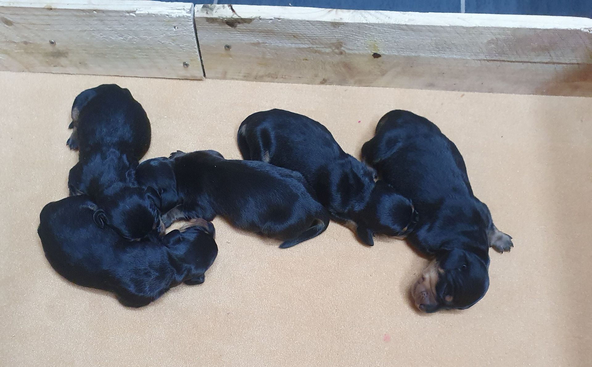 Es sind 5 kräftige, gleichmäßige und sehr mobile Welpen in der Farbe schwarz/rot gewölft worden.