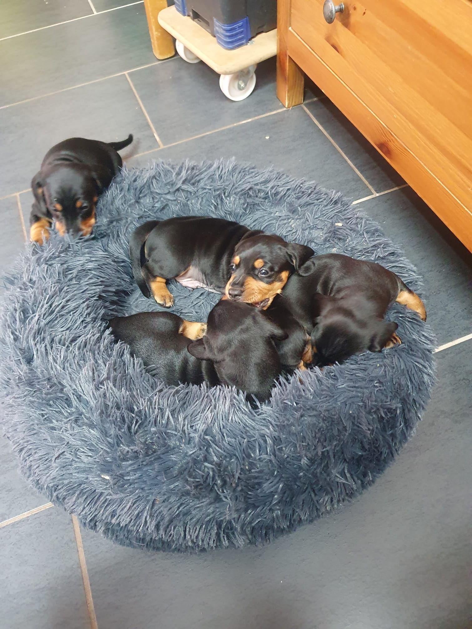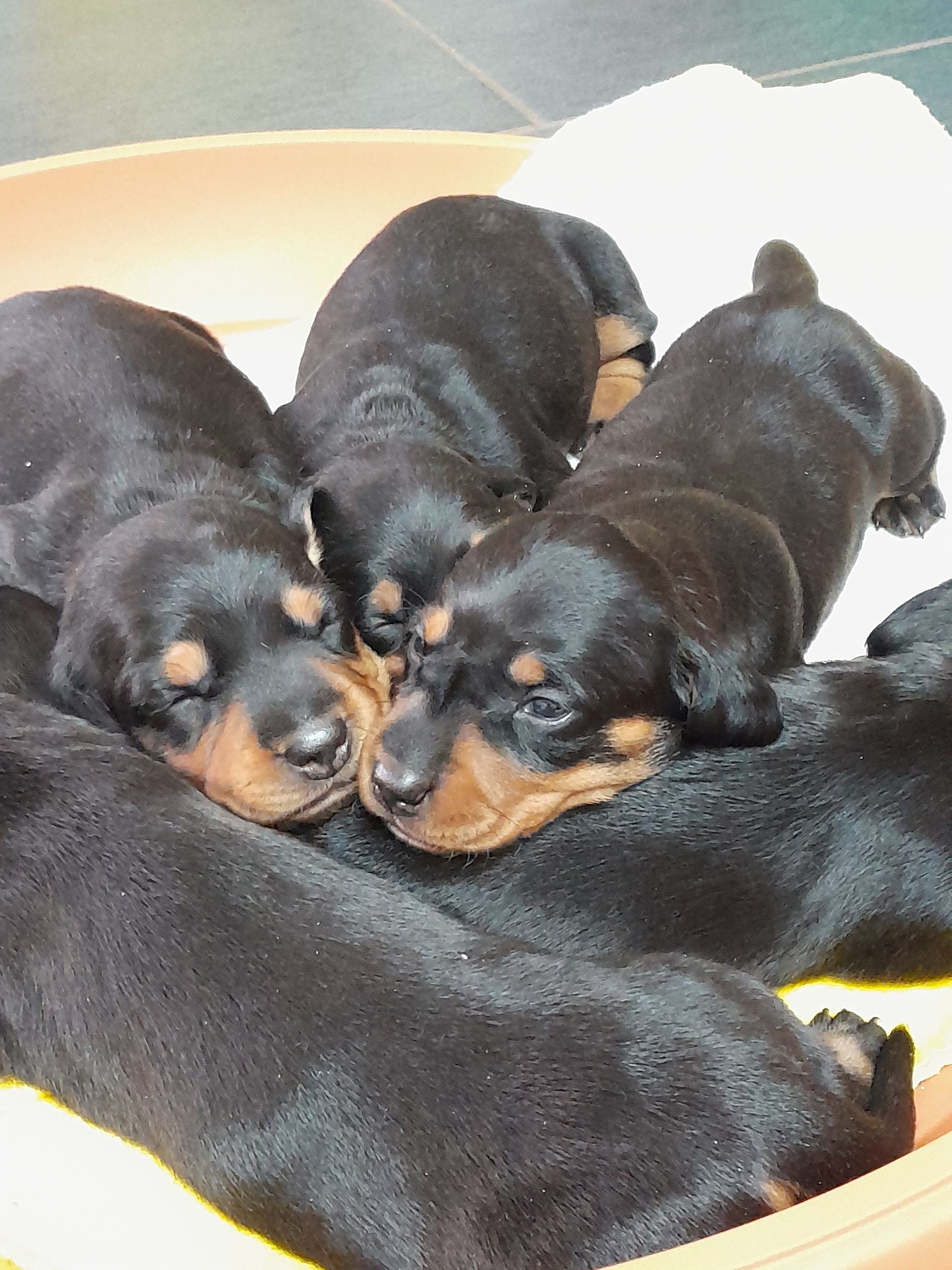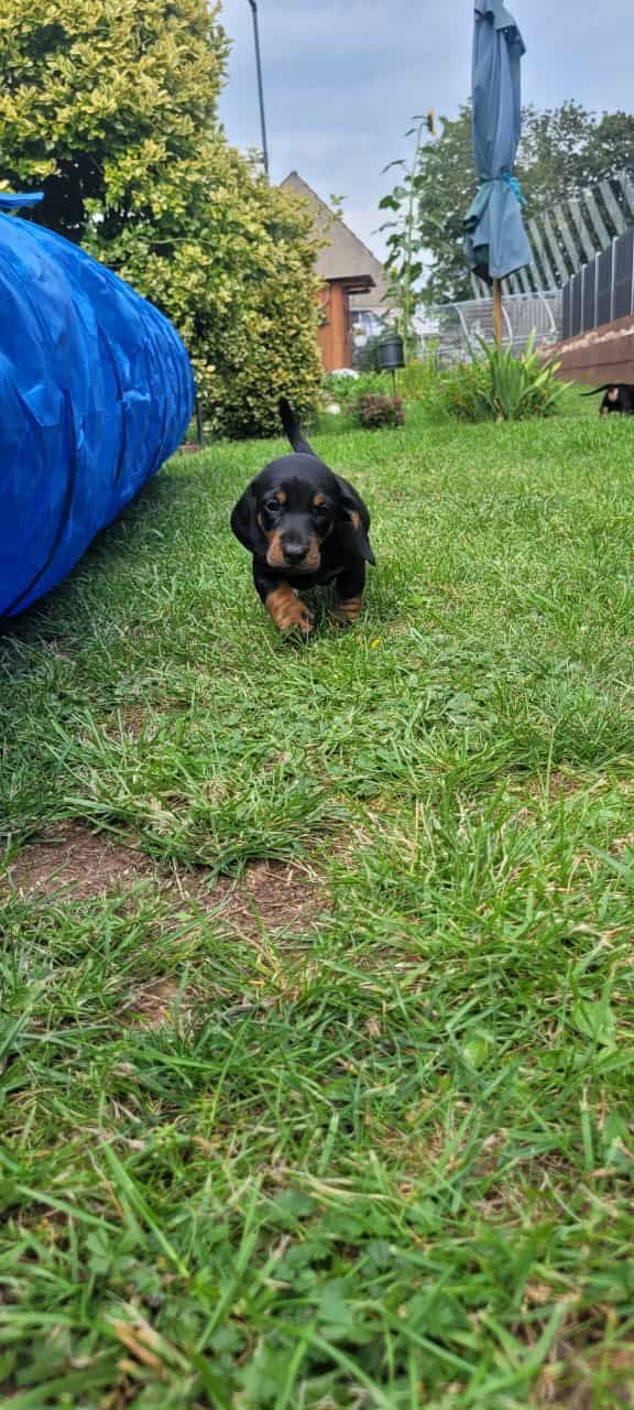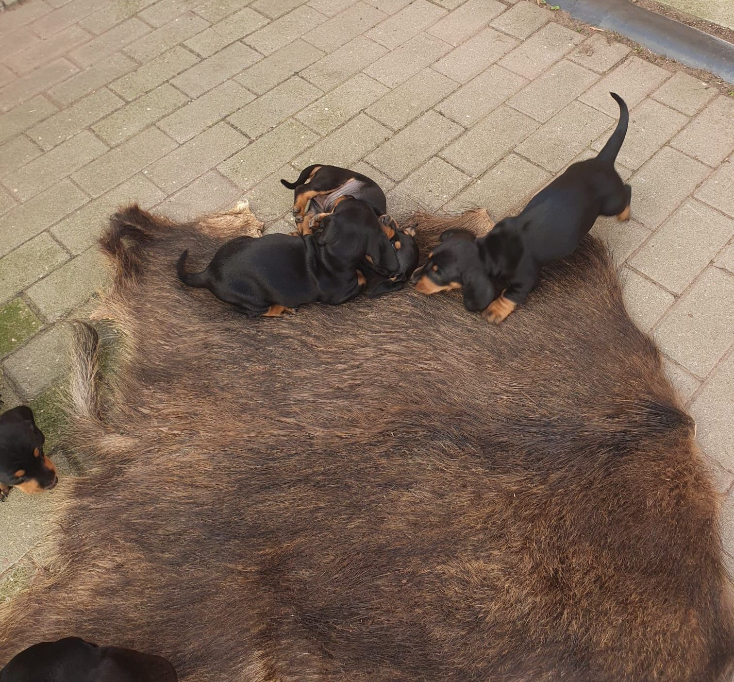 Es sind 5 kräftige, gleichmäßige und sehr mobile Welpen in der Farbe schwarz/rot gewölft worden.