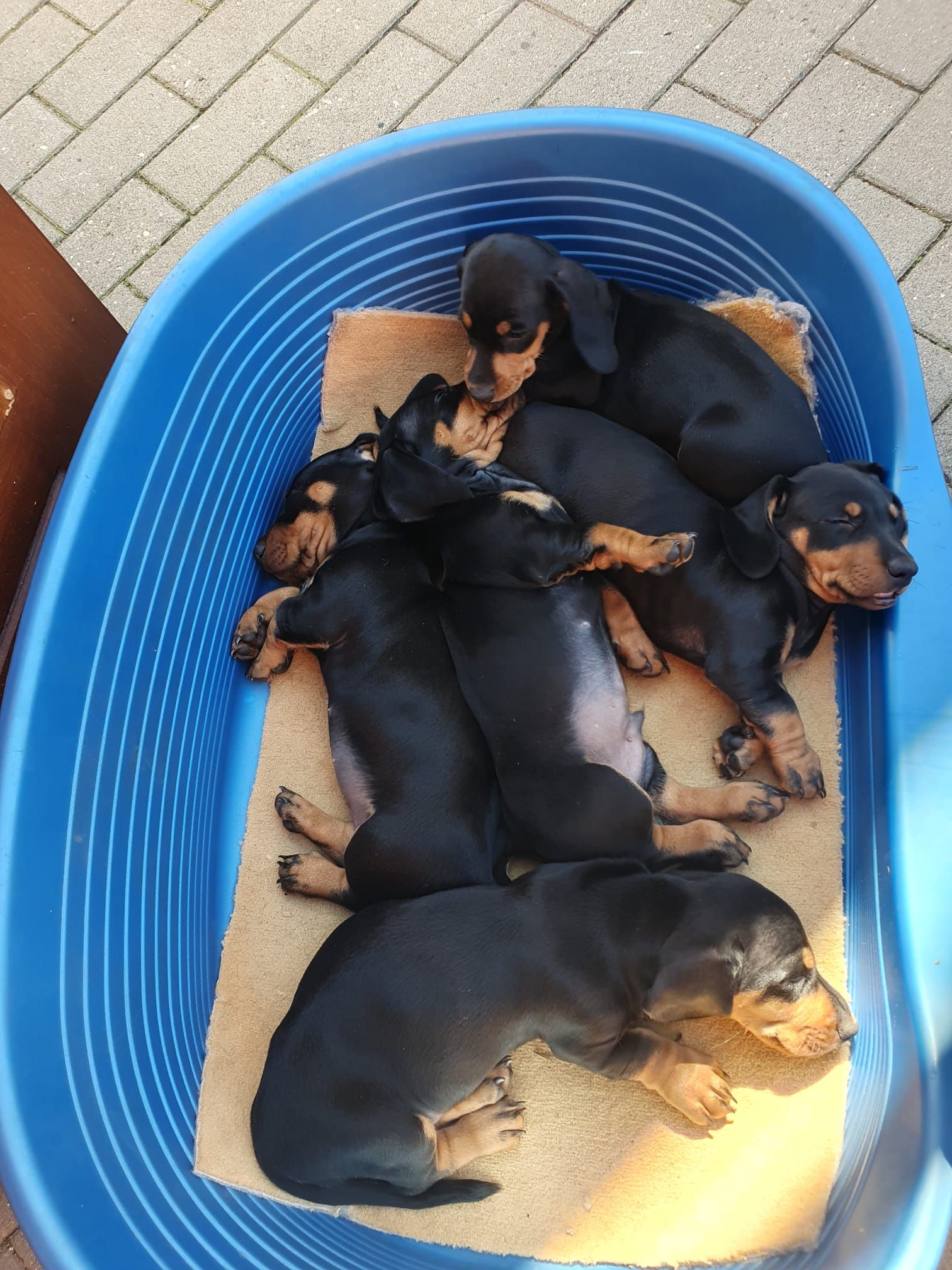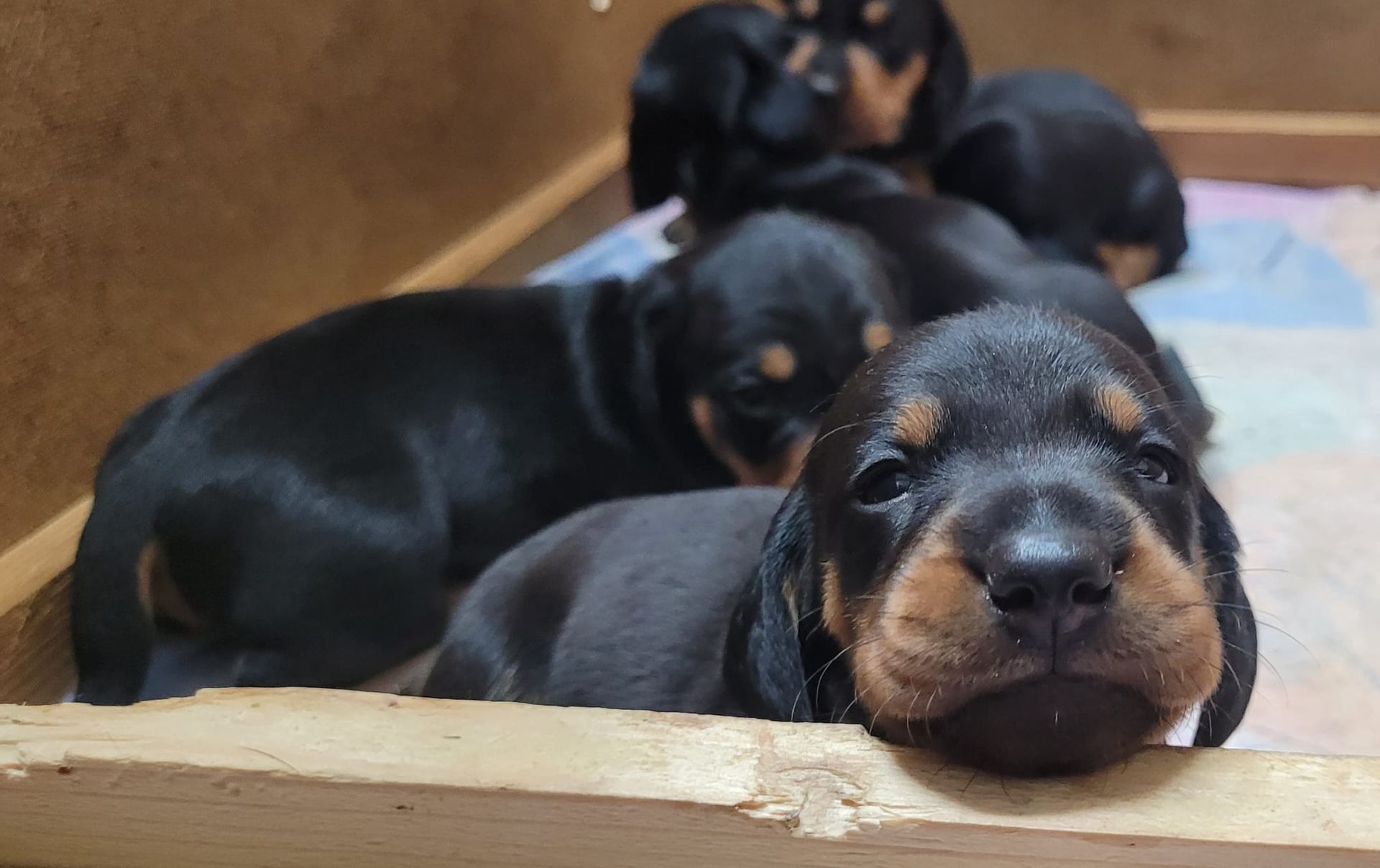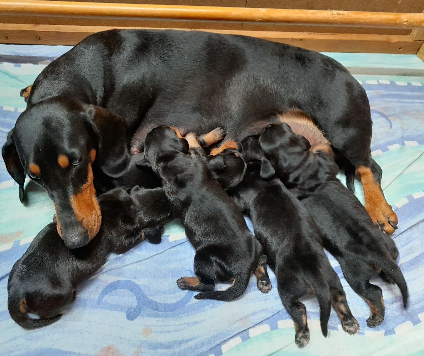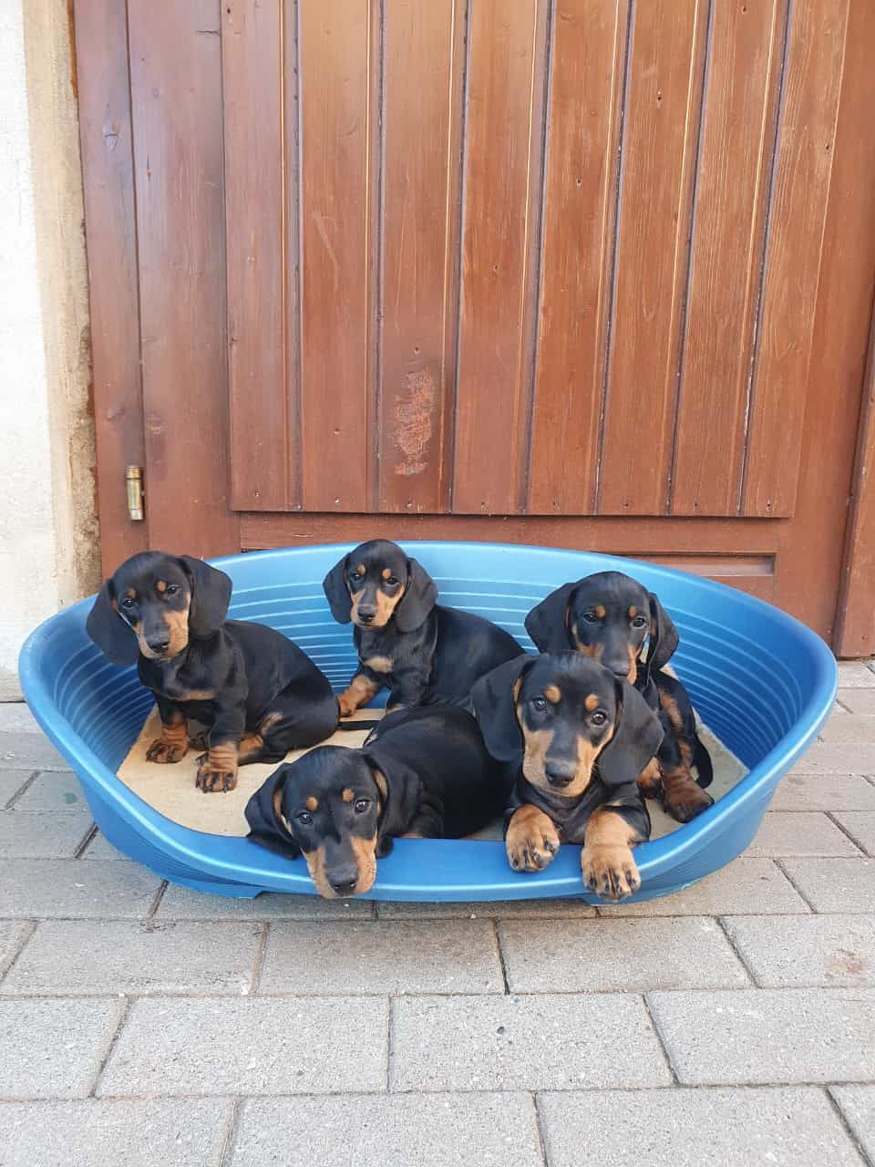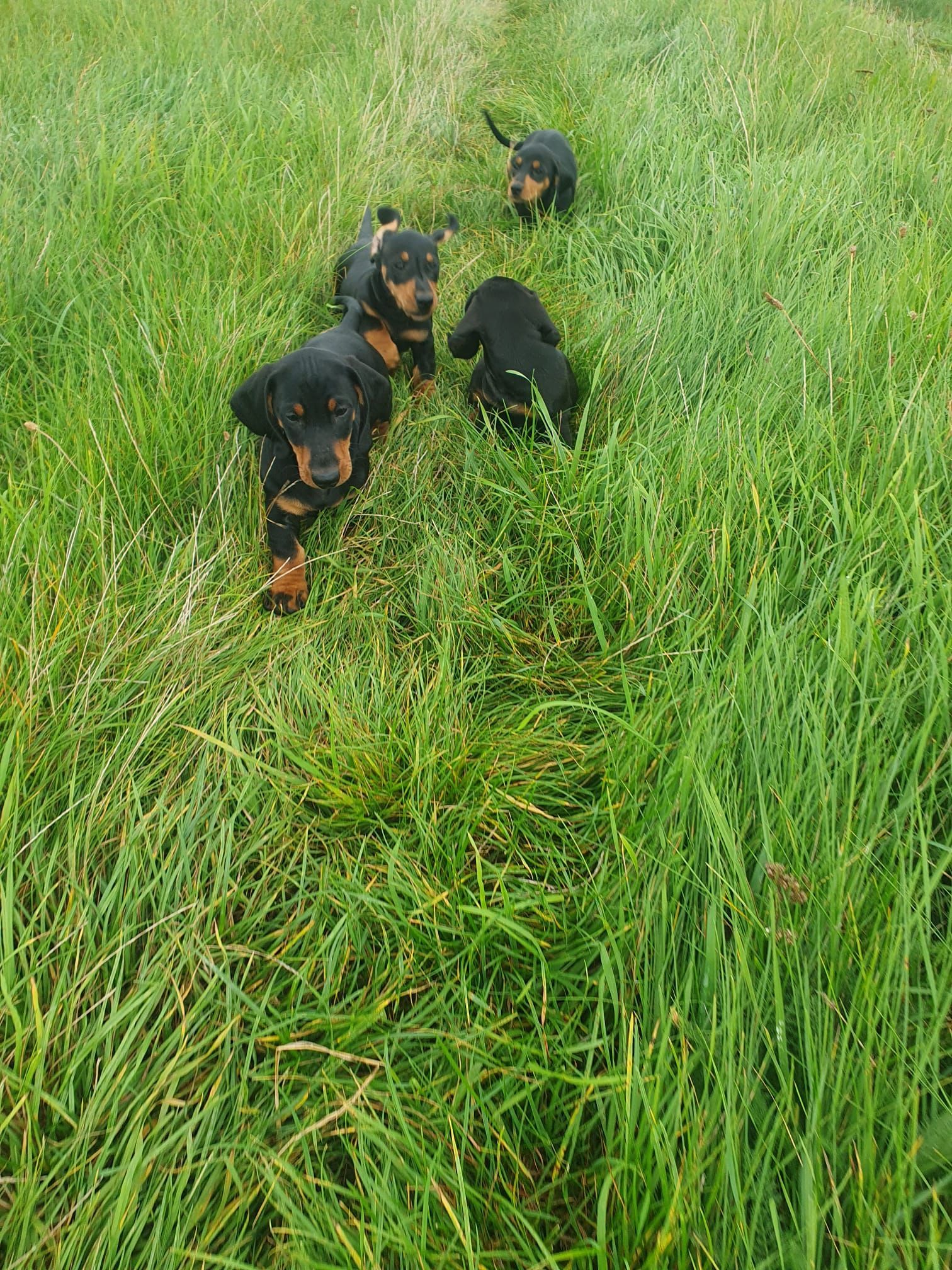 Es sind 5 kräftige, gleichmäßige und sehr mobile Welpen in der Farbe schwarz/rot gewölft worden.