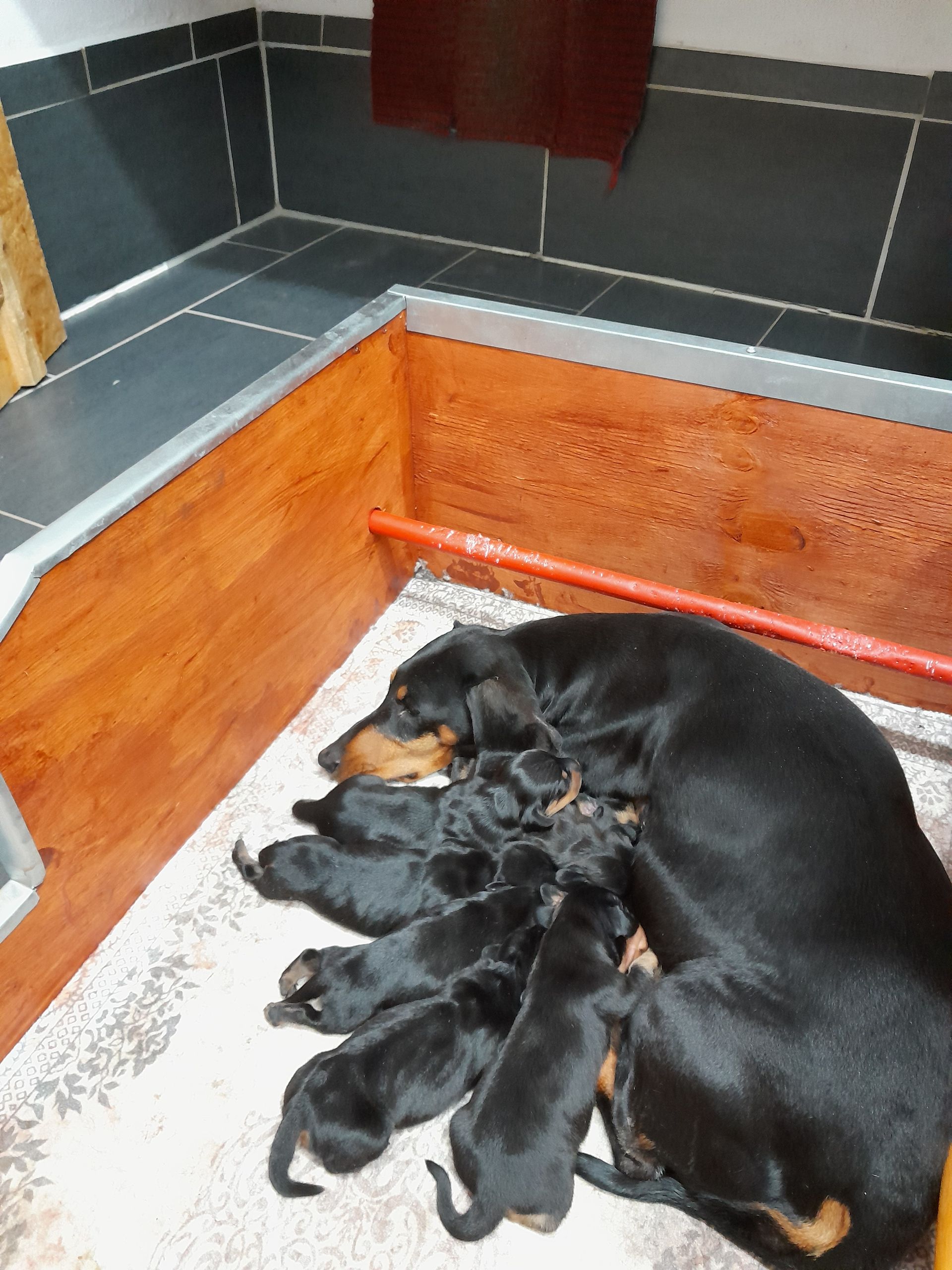 06.10.2025 unsere Kleinen sind jetzt 1 Woche alt und haben gut zugelegt. Bella hat sich zur Übermutter entwickelt und lässt ihre Welpen kaum aus den Augen. Ein Besuch an der Wurfkiste wird mit einem rauen Blick und Ton quittiert, was sich jedoch gleich wieder legt, wenn sie uns erkennt.