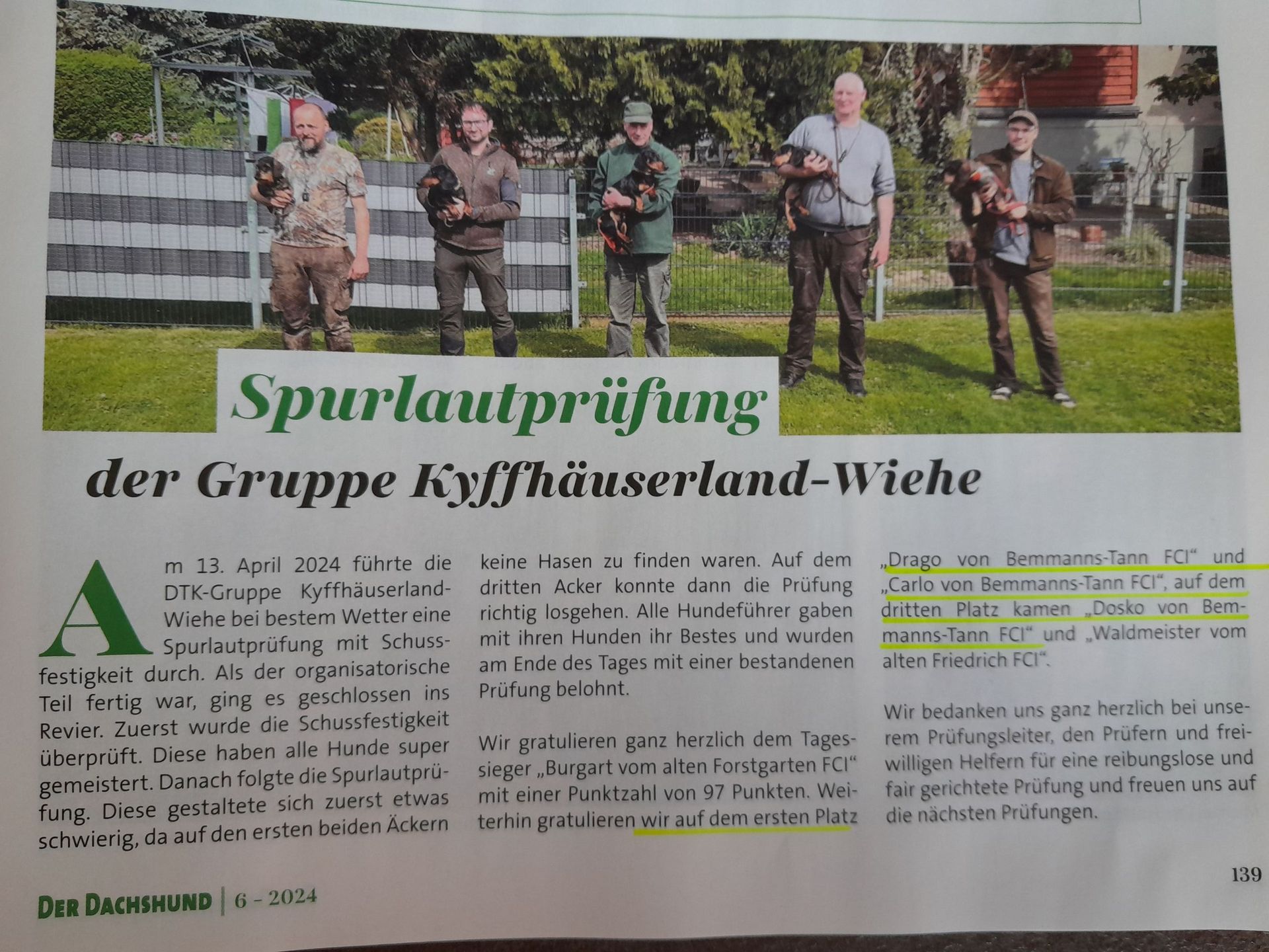 14.12.2024 Dosko v.- Bemmanns-Tannen hat heute bei der Gruppe Birkholz im Revier Frauensee erfolgreich die 1000m DTK-Schweißprüfung absolviert. Gratulation und Weidmannsheil an das Gespann zu diesem guten Ergebnis.